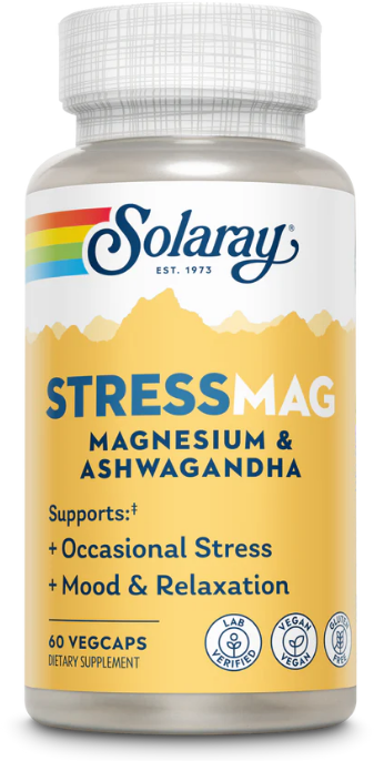 Solaray StressMag combines our in-house chelated magnesium glycinate with a clinically studied form of ashwagandha, which provides powerful support for relaxation, mood, and occasional stress while helping regulate the body’s stress response system.* This high-quality supplement is produced in our GMP facility certified by NSF, and tested to meet strict guidelines on potency, purity, and contaminants